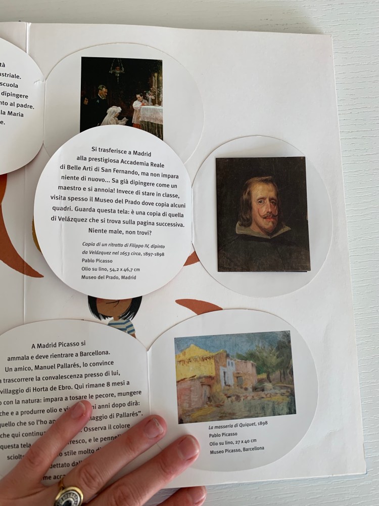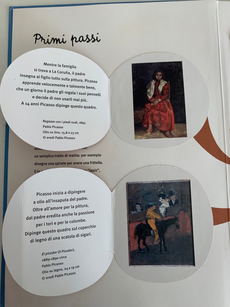 Il libro su Picasso è stato l’unico ad aver suscitato sin da subito grande interesse in lui. Credo perchè si tratti di un testo davvero a prova di bambino, con tanti inserti da poter toccare e osservare, qualche pop up qua e là e finestrelle da aprire e chiudere. E’ un testo molto accattivante. Si tratta di “Guarda che artista! Pablo Picasso” di Patricia Geis edito da Franco Cosimo Panini e lo trovate in vendita anche on line http://www.francopaniniragazzi.it
